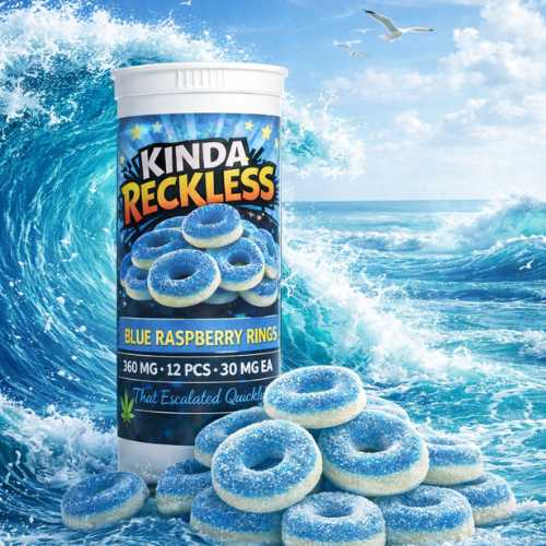 Kinda Reckless Blue Raspberry Rings combine the unmistakable tangy sweetness of electric blue raspberry candy with a chewy sugar-coated ring. Bright flavor meets bold potency in every bite.