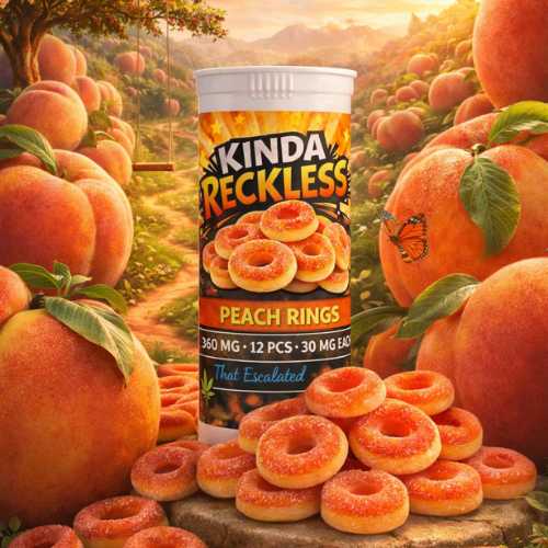 Kinda Reckless Peach Rings bring the iconic sweet-and-juicy peach flavor everyone loves. Soft, chewy, and perfectly coated in sugar, these rings deliver bright candy flavor with a smooth cannabis-infused kick.